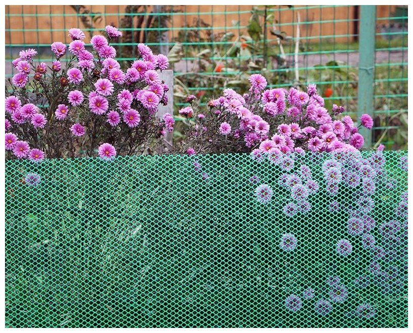 Невысокая пластиковая сетка выполняет оградительную функцию и служит для украшения и зонирования территории. Сетка хорошо подходит для ограждения цветочных клумб, тем самым защищает посадки от вытаптывания и радует глаз своей эстетичностью, придает клумбе законченный вид.